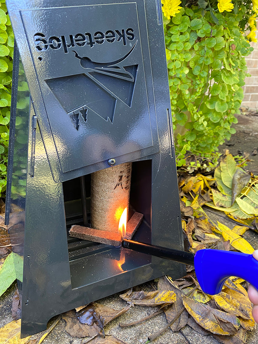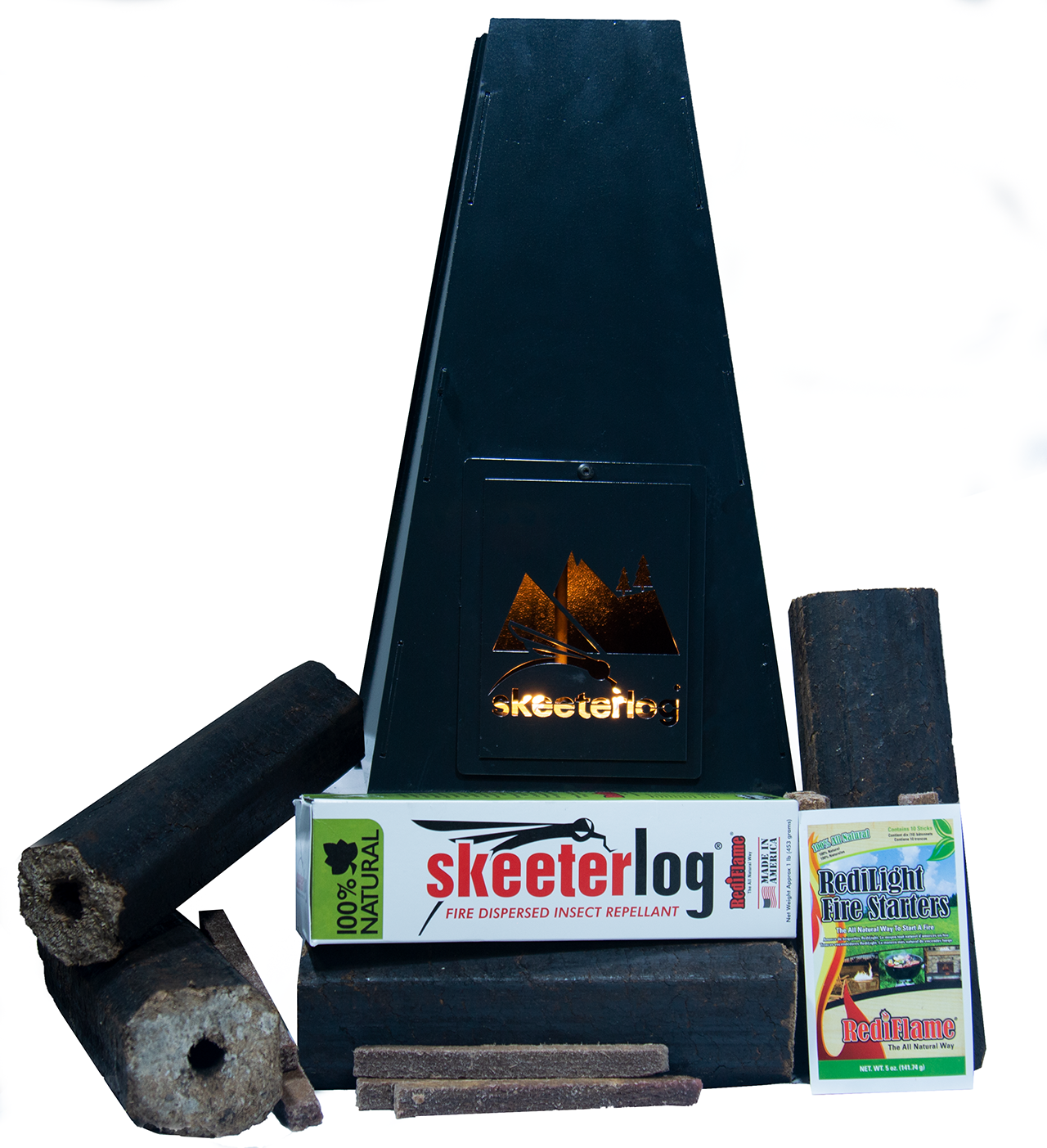 - Kit contains: 1 Skeeterlog® Steel Chimney, 2 Skeeterlogs® and multiple fire starters.
